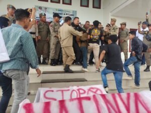 Namun, upaya pembakaran ban dihalangi oleh personel Satuan Polisi Pamong Praja yang langsung merampas ban milik demonstran. Tindakan ini memicu bentrok antara massa aksi dan aparat keamanan, yang sempat meluas hingga ke dalam area kantor DPRD.